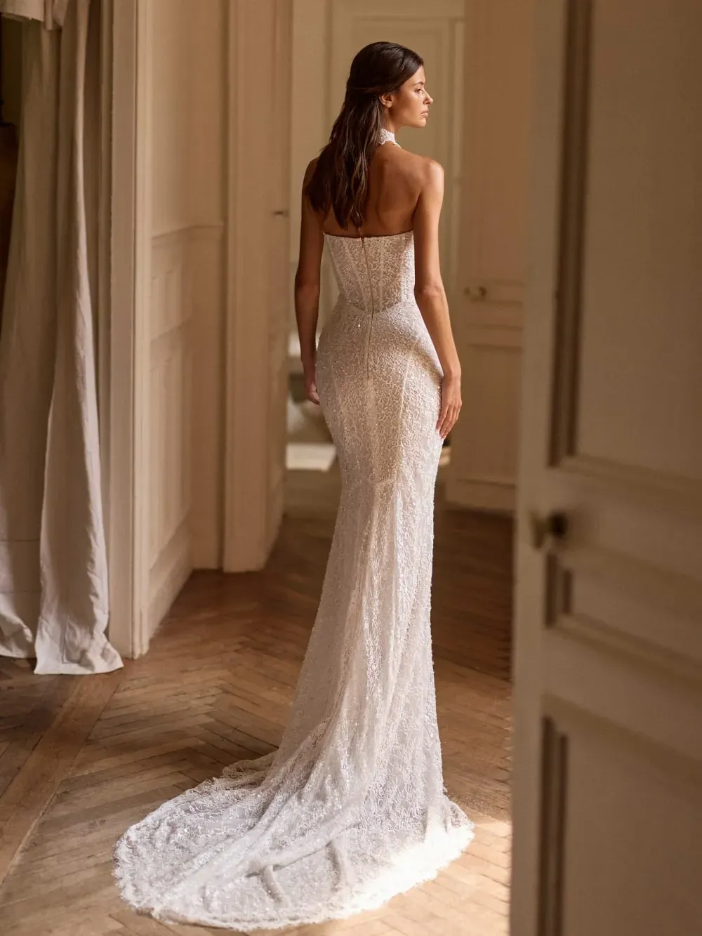 Intricately crafted sequined lace is layered with hand-applied 3D lace appliqués, creating depth, shimmer, and couture detail from every angle. The straight-boned corset bodice, inspired by Melrose-style construction, sculpts and supports the figure, while the semi-sheer maxi skirt flows effortlessly into a soft, dramatic train.