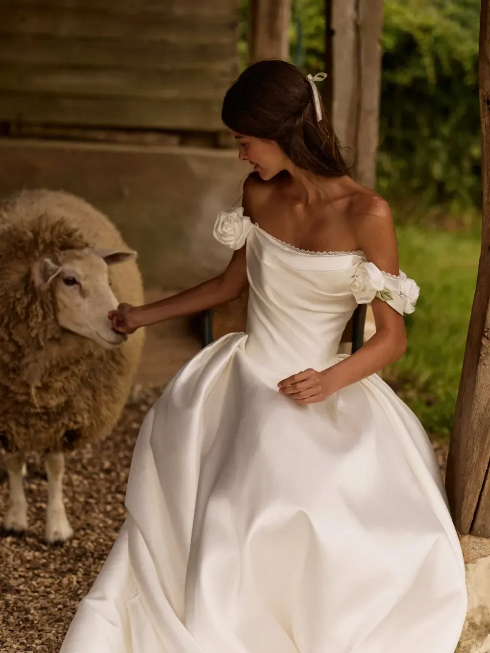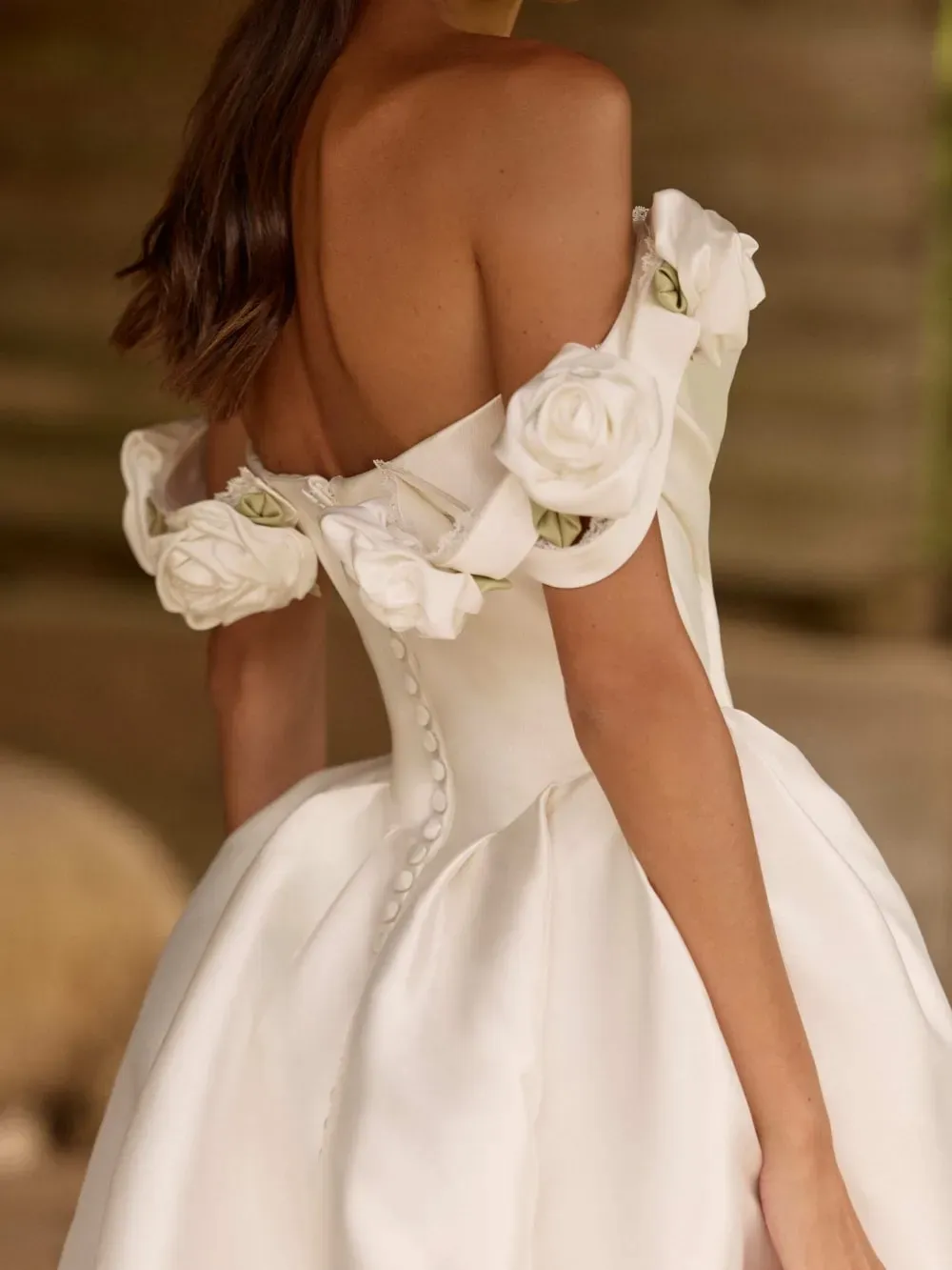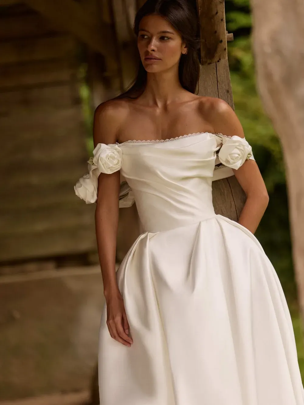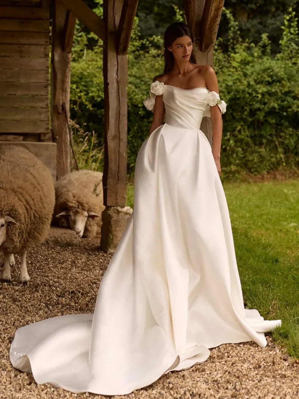 Soft draping through the corset bodice adds dimension and movement, while a straight neckline frames the décolletage with understated sophistication. A dramatic A-line skirt flows into a long train for a striking aisle moment. Detachable off-the-shoulder straps adorned with delicate white rose accents offer a romantic styling option, allowing the bride to personalize her look from ceremony to reception.